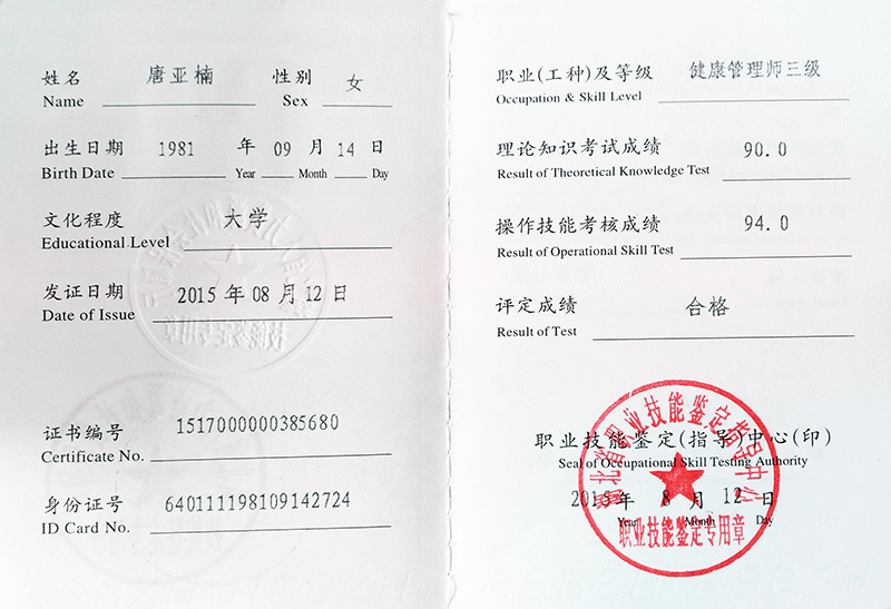 唐亞楠總經(jīng)理獲得健康管理師資格